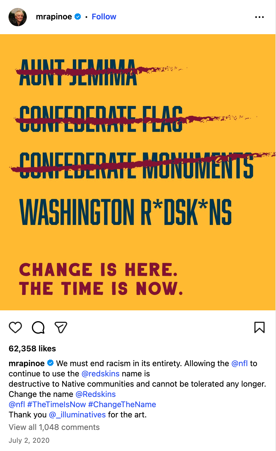 On July 13, 2020, the Washington Football Team announced it would retire its racist name and logo.